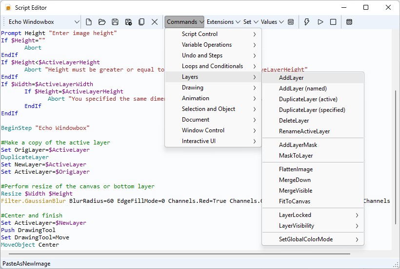 The scripting language supports variables, conditionals, loops, and access to the majority of NPS Image Editor's functionality. Even more functionality will be added over time.